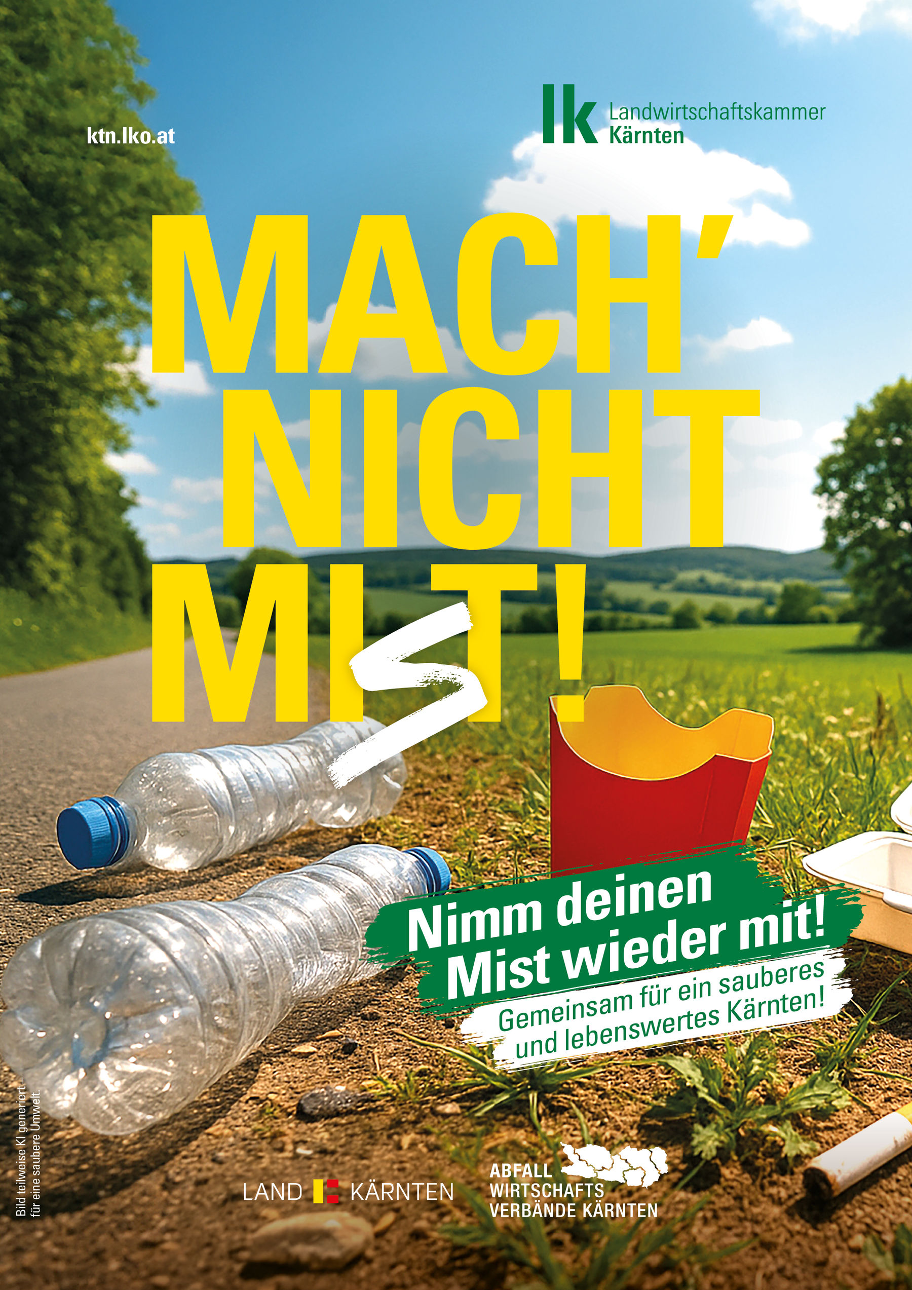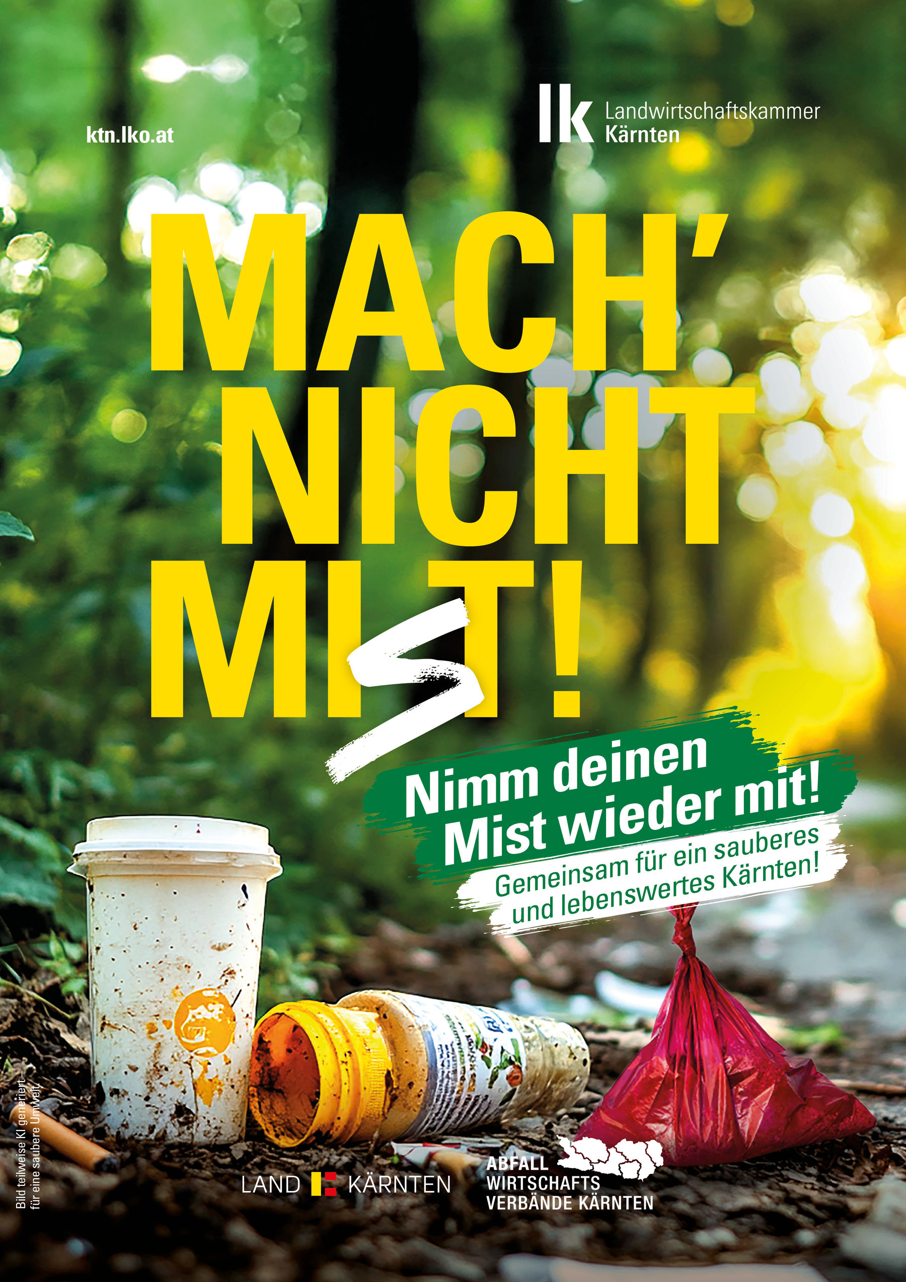 Seit Mittwoch, den 09. Juli, läuft der Radiospot zur Kampagne „MACH NICHT MI(S)T – für ein sauberes und lebenswertes Kärnten“ auf Antenne Kärnten. Den Spot können Sie auch auf ktn.lko.at/​​ nachhören. Ab 14. Juli hängen dann auch die Plakate zur Kampagne kärntenweit bis Mitte August.